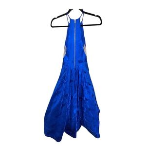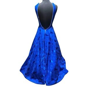 An unforgettable showstopper in rich royal blue, this embroidered mikado ball gown by Sherri Hill features a dramatic full skirt, illusion plunge neckline, and striking racerback design with illusion mesh side panels. While the front silhouette matches Style 51703, this version features a unique racerback closure—suggesting it may be a rare variant or special-order edition. Please note: the mannequin shown in photos is not a size 0, so the back of the dress is displayed unzipped to showcase the full volume and drape. A separate photo is included showing the back zipped off the mannequin. This gown has been kept in excellent condition and is the perfect choice for prom, pageants, or any formal event where a grand entrance is a must.