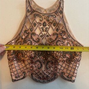 • Features: Sleeveless, two-piece design, shimmering fabric, beaded embellishments