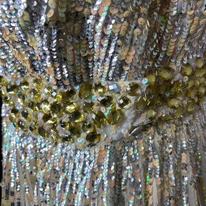 Please note there is a row of sequins missing from the bodice. This can be easily fixed by a seamstress using the same colored sequins or even taking some from a part of the dress that is less noticeable. The dress has so many sequins. There are a few beads missing as noted. It’s a heavily beaded gown so it’s bound to happen. Also on the hem there is a tiny rip that is not noticeable but noteworthy. Also noted in photos. Price reflected.
