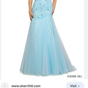Sherri Hill size 2 skirt blue. Lace on the top part of the skirt is 17” long the entire piece from top to bottom is from the front 47" and from the back 59” long. Waist is 13.5” laying flat. Perfect for a formal event or photo session! The last 3 photos are stock photos for illustrative purposes only that shows what the skirt may look like on, but is not in the same color/design as the one I have.