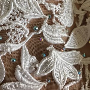 Custom made lace in a leaf and vine motif adorns this best fitting cap sleeve chiffon gown complete with satin waist belt and full length skirt. Worn once. Little to no wear. Open to negotiation!
