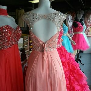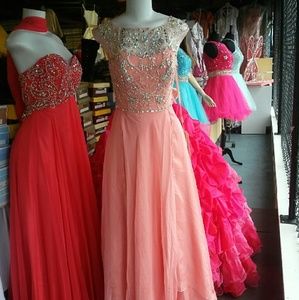 Size M With beautiful detail at the top it is full length and the color is coral??