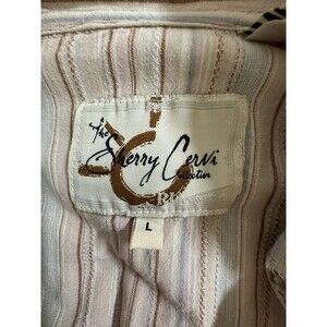 This Sherry Cervi Western Shirt in size Large is a stylish and versatile addition to any woman's wardrobe. Made from 100% cotton with a woven fabric type, this long sleeve button-up shirt features a collared neckline, fringe accents, and a beige stripe pattern. Perfect for travel, casual outings, or workwear, this vintage-inspired shirt is easy to care for with machine washable instructions. The shirt also includes pockets, making it functional and practical for everyday wear. Ideal for spring, summer, and fall seasons, this lightweight shirt is perfect for adding a touch of Western flair to any outfit. Shirt is in great preowned condition with no obvious flaws holes or stains. Measurements in photos. I appreciate your business and strive for a five star rating. Please feel free to message with questions.