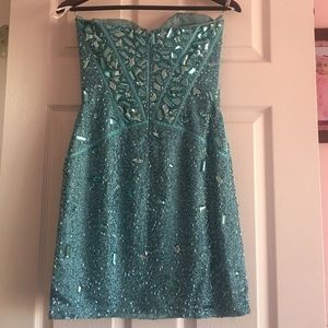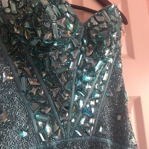 Stunning evening dress made by sherry hill worn only once!! Size 2 beautiful beaded with jewels through out entire dress. Beautiful teal bluish color!!