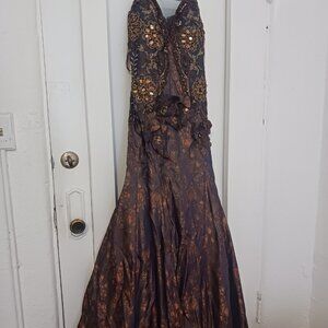 PERFECT CONDITION. Brown and blue. With shawl. Flower applique. Trumpet/mermaid style. Beaded. Photos with and wo flash. Video with flash. Gently used. The bottom back of the dress slightly lower/asymmetrical. Floor length.
