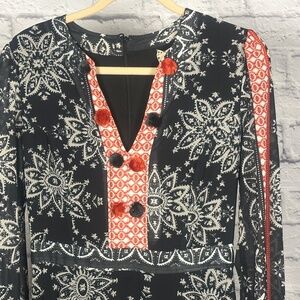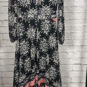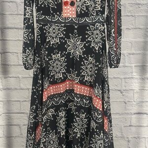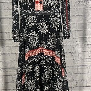 Beautiful boho maxi dress with navy and red mixed print pattern. Features sheer long sleeves, a v-neckline with button detail, and a flowy tiered silhouette. Lightweight and perfect for vacations, brunch, or effortless everyday style.