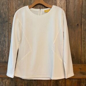 Beautiful, classy long sleeve lightweight sweater with a back zip, top. It has a monochromatic quilted design.