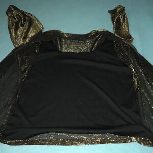Two in one blouse, squared neckline, button cuffed long sleeves, shimmering sheerness gold and black threads. Black material is not sheer.