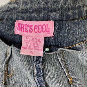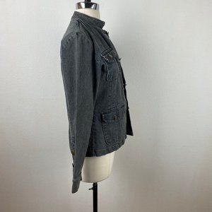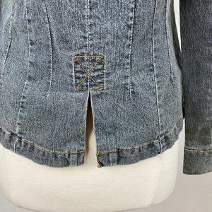 She's Cool Fitted Denim Jacket Pockets Mandarin Collar Button Front Dark Wash SM