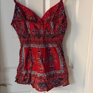 This vibrant red camisole from She's Cool features a smocked, fitted design that accentuates your silhouette. The sleeveless style is perfect for warm weather, while the intricate black detailing adds a touch of elegance. Ideal for both casual and dressy occasions, this top is a versatile addition to your wardrobe.