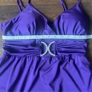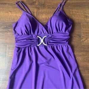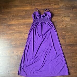 Elegant maxi dress in vibrant purple. Features a unique waist detail. Perfect for evening events.