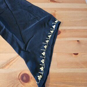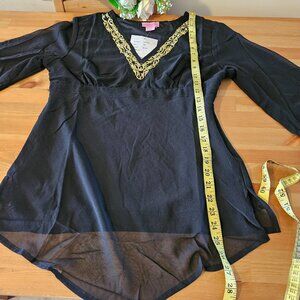 Beautiful vintage V-neck blouse with gold floral lace on neckline and sleeves, side closure and wide 3/4 sleeves