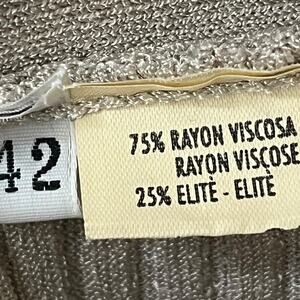 This She's So women's top is made in Italy from rayon knit fabric with a ribbed texture. It features a V-neckline, wide straps, and a pullover closure. The sleeveless tank top has a side slit and pockets, making it perfect for travel or casual occasions. The beige color and solid pattern add a touch of elegance to the basic style. The top is a regular fit and comes in size S (42). It is recommended to dry clean only. This item is not vintage and is not personalized. It is suitable for wear in winter, fall, and spring. The brand is She's So and the top is a basic type with features such as slit and pockets.