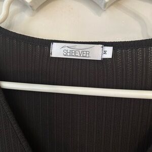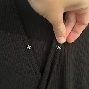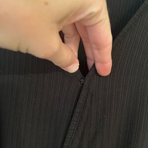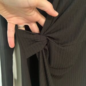 This elegant black dress features a sophisticated design with long sleeves and a stylish knot detail. Perfect for any occasion. It is very stretchy and it is sewn pretty far down under the wrap portion so that your whole leg doesn’t show. It’s a fantastic “modest” version of a wrap dress!