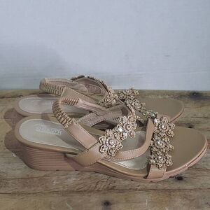 Shibever tan boho wedge sandal. Comfort sling back flower embellished. Never worn