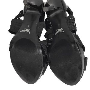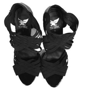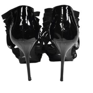 Eye Catching, Classy Black Elastic Strapped and Patten Stiletto 4 inch Heel. Open toe with multiple tightly secure elastic straps, patten cup heel and insole. Gently worn. Perfect with your "Little Black Dress".