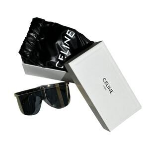 Mask style sunglasses with gold trimming reflective lenses, and logo engraved.