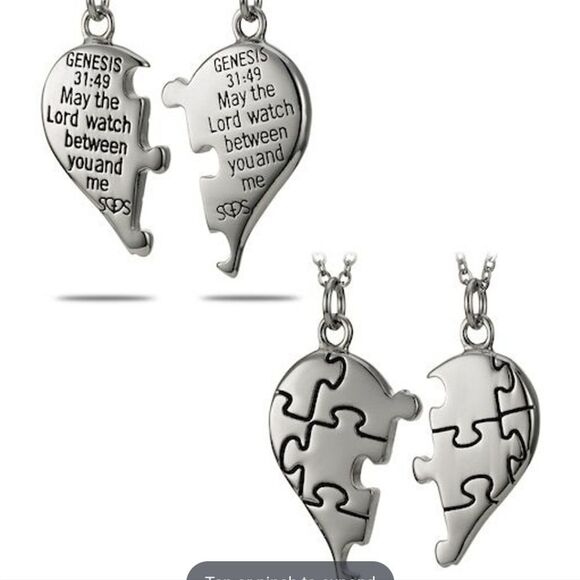 Friendships or family bonds will be strengthened with the sharing of this beautiful two-piece stainless steel split heart necklace. This necklace features a heart pendant with a puzzle piece split, so one half can be worn by each friend. Each side of the split contains the special verse from Genesis 31:49, which reads "May the Lord watch between you and me." The back side of the pendant has more jigsaw lines to mimic the look of a puzzle. The necklace measures 1.2 inches by 0.58 inches, and each side comes with a solid stainless steel link chain that is adjustable between 18 and 21 inches. This fashionable 2 piece heart necklace proves that no distance is too great for the love of friends and the protection of God.
