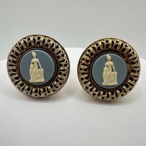 Excellent condition, these unisex beauties show only hints of wear. Fronts feature Wedgewood-style coloring and a full bodied seated Greek woman or goddess framed in a ring of embossed gold tone machine filigree. Both swivel components rotate smoothly. Please see photos for measurements in inches.