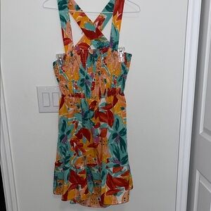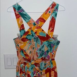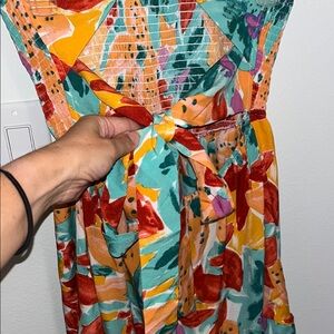 Bright womans dress featuring a vibrant mix of colors. Perfect for adding a splash of fun to any day. Size Large