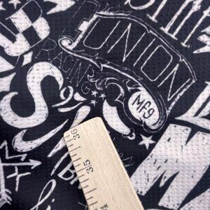 Large "SHIFT" logo and multi-font allover script graphics with skull, stars, racing motifs