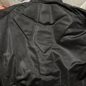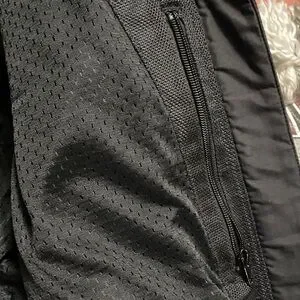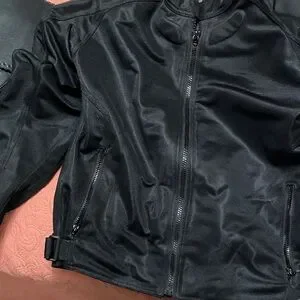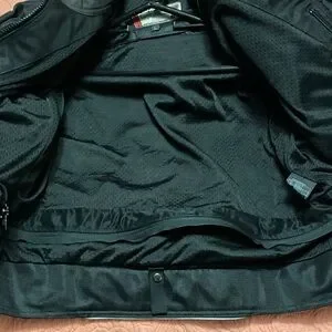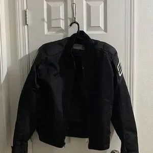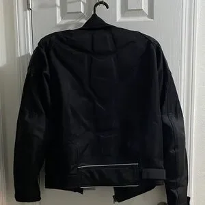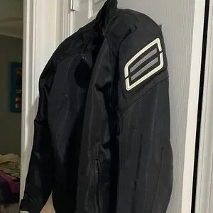 Shift motorcycle riding jacket with pads on shoulders and elbows. Light padding on back. side pockets with a zipper pocket inside.