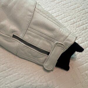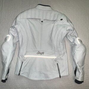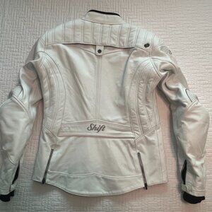 Women's size M Shift brand white leather motorcycle jacket with reinforced elbows and shoulders. Comes with a gap opening in the back to add padding. Removable inner liner can be washed. Loop at the bottom to attach to belt. Lot's of zipper pockets, zipper sleeves with velcro closure, snap neck.