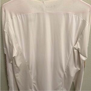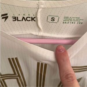 Lightweight long sleeve jersey. White body with metallic gold SHIFT logo. Crew neckline and athletic cut. Breathable fabric for active use. Clean, bold graphic styling. 27 inch length