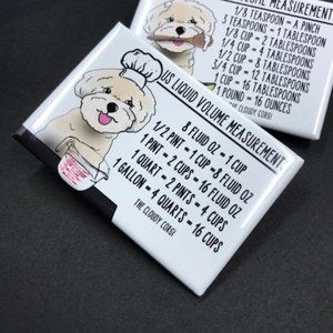This handmade magnet set features hand illustrated dogs with handy conversion charts you can reference while cooking or baking!