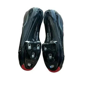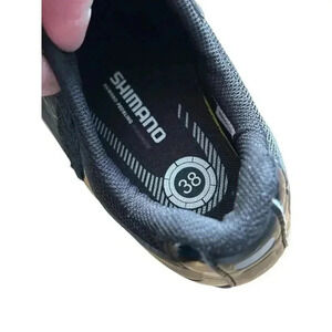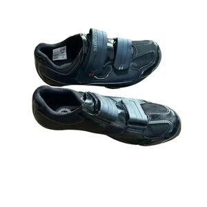 Shimano Black Pedaling Cleat Shoe Mountain Bike Cycling Size 7.5 US (38) RO65. These cycling cleats have some minor scuffs and scrapes. It looks like one screw is missing from one bottom of the cleat. See pictures.