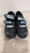 Shimano clip on spinning shoes with a sleek black design. Accented with blue and silver details. Features secure strap closures.