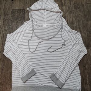 Stylish top with gray and white stripes. Soft fabric for comfort.