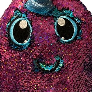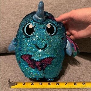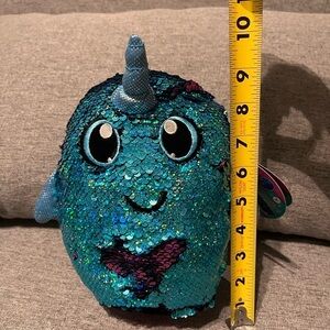 Shimmeez narwhal stuffy with reversible sequines. Swipe up and down to change between blue and purple. Its name is Arlo. ❤️