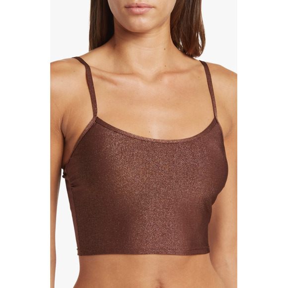 Mix and match this cropped bikini top featuring a shimmering metallic finish for a sleek, en vogue beach look.