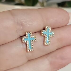 Gorgeous little pieces.. dainty crosses of handpainted enamel trimmed in crystal shimmer, with 925 silver posts.