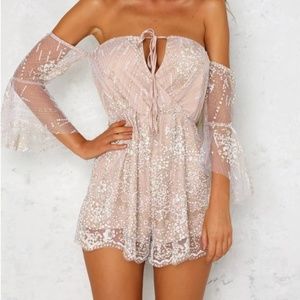 Prepare to be all glittered out! The off the shoulder design features a cross-over, elasticated, v-neckline with tie up detailing. It has an elasticated waist for ease of wear. The nude lining, is layered with a delicate, gold and white glitter tulle. *GLAM OVERLOAD* Style yours with thin, strap heels + bronzed makeup!