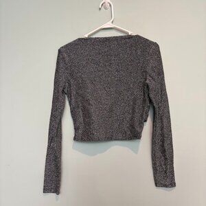 Style- metallic, wrap top, long sleeve, shimmer, silver, glitter, shiny, club, cocktail, dressy, going out, bachelorette, party, holiday, night out