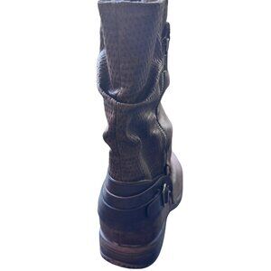 Retro slouch boot with buckle, strap accent, and zipper