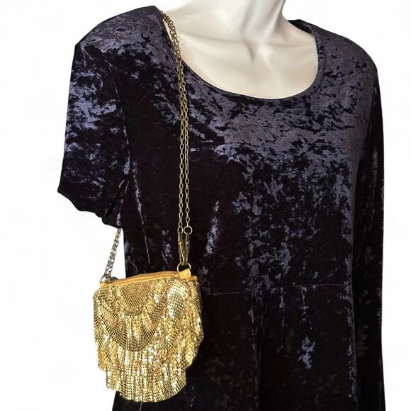 This shimmering gold mesh and satin evening bag is the perfect blend of glamour and function, featuring a secure zip closure and convertible crossbody strap. Ideal for parties, weddings and holiday events, it adds a sparkling statement to any outfit.