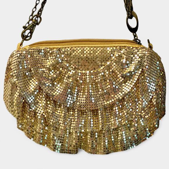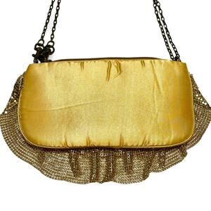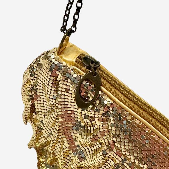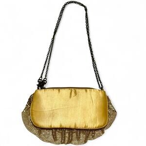 Shimmering Gold Mesh Evening Bag Zip Clutch Crossbody Glam Satin Chain Strap