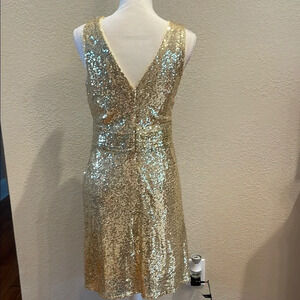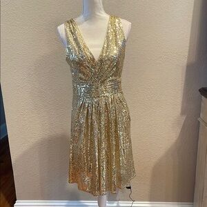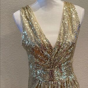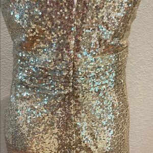 This glamorous shimmering gold mini sundress features a deep V-neckline and a sleeveless design, perfect for making a statement at cocktail parties. The dress is adorned with sequins that catch the light beautifully, creating a luxurious look. With a defined waistline, it offers a flattering silhouette that enhances your figure. The material does have some stretch.