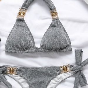 Shimmering Gray Silver Crystal Jeweled Bikini Set