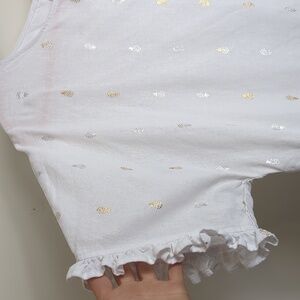 Such an adorable little top in a linen and viscose blend with rounded neckline ,ruffled half sleeves, and ruffled hemline. Shimmering gold and silver pineapples. keyhole closure and back. semi-sheer