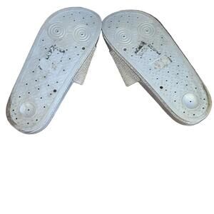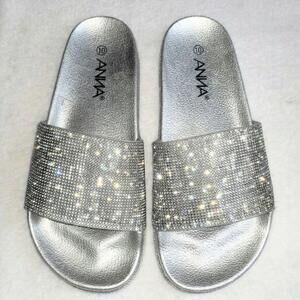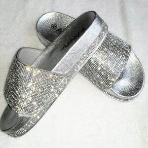 Step into effortless glamour with these stunning silver slide sandals. Designed with a sleek metallic footbed and a wide strap covered in sparkling rhinestones, these slides catch the light from every angle. The cushioned sole offers all-day comfort, while the easy slip-on design makes them perfect for casual outings, vacations, or dressing up a simple outfit. Stylish, lightweight, and eye-catching, these sandals are the perfect blend of comfort and shine.