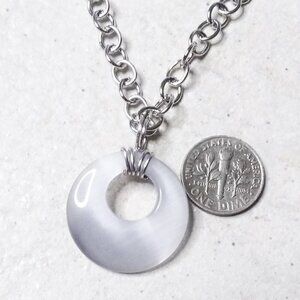 This lovely Donut Pendant is a shimmering, slightly iridescent silvery grey CatsEye stone, with a minimalist wire wrapped bail. I added a 19" stainless steel chain to it, that is freely adjustable. Simply hook the lobster claw clasp into any of the links to adjust the length.