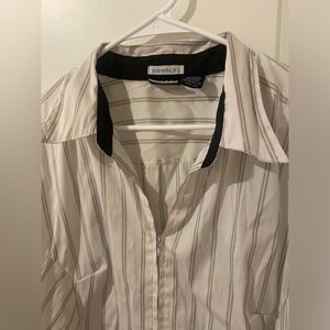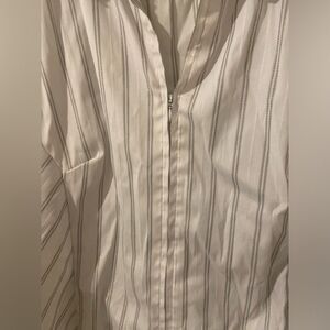 This zip-up blouse features gold sparkle stitching. Lots of stretch. There is a SMALL STAIN on one of the arms - however, it is barely noticeable.