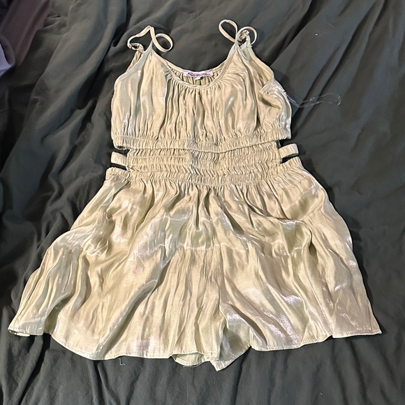 Elegant shimmery cream romper with gathered details and spaghetti straps.