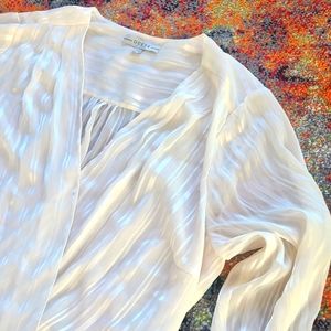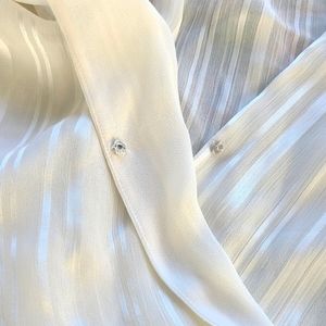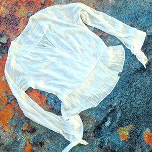 Gorgeous blouse with shimmering white tones from GUESS. Size large. Tiable wrists. Deep V-cut front with optional button as shown in photos.