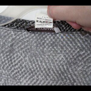 Flattering JUS D'ORANGE Gray, Black & White Stretch Faux-Wrap Dressy Blouse, with a somewhat cowled neckline. Blouse is in a stupendous Mottled Crosscut Pattern print, with a Golden Metallic Sheen within the fabric. This gorgeous *MADE IN FRANCE* blouse is sized like a Misses Size S, and is in overall excellent condition. Top's size / materials tag has worn off (see picture 5).