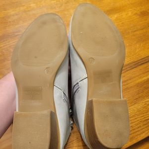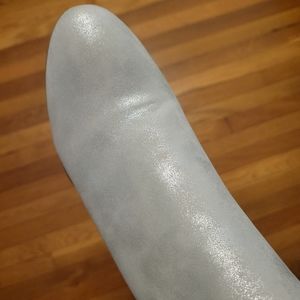 Light silver booties with a subtle sparkle and shimmer, zip up the side, low heel with a silver adornment across the back. I don't think I ever wore them so they're NWOT or EUC, included a photo of the bottoms. There is a small mark on one shoe, as shown in last picture